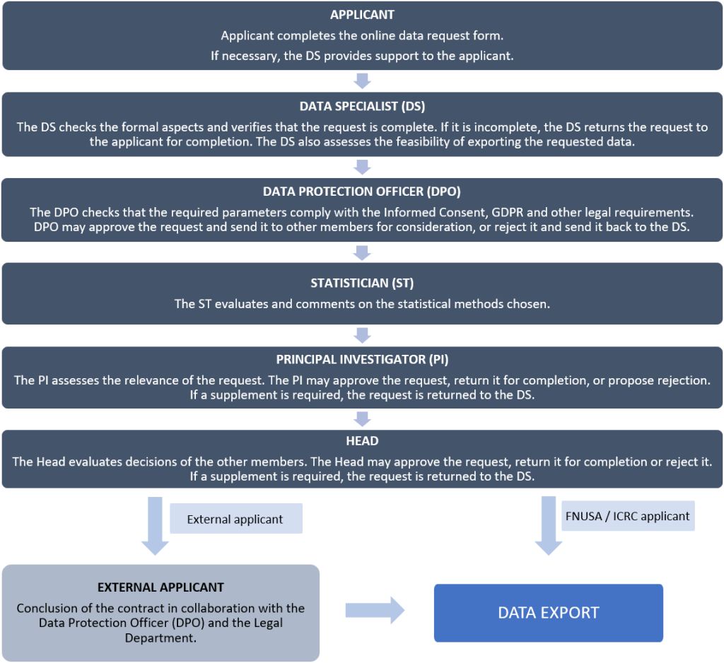 Data are requested via an online form, the approval process is electronic and applicants are notified of the outcome. The request, including the proposed methods, is also evaluated by our Biostatistics department, where we may suggest a more appropriate procedure and methodology or you can directly request our services. All requests for data, including the actual transfer of data, are recorded. Information security is always our first priority.