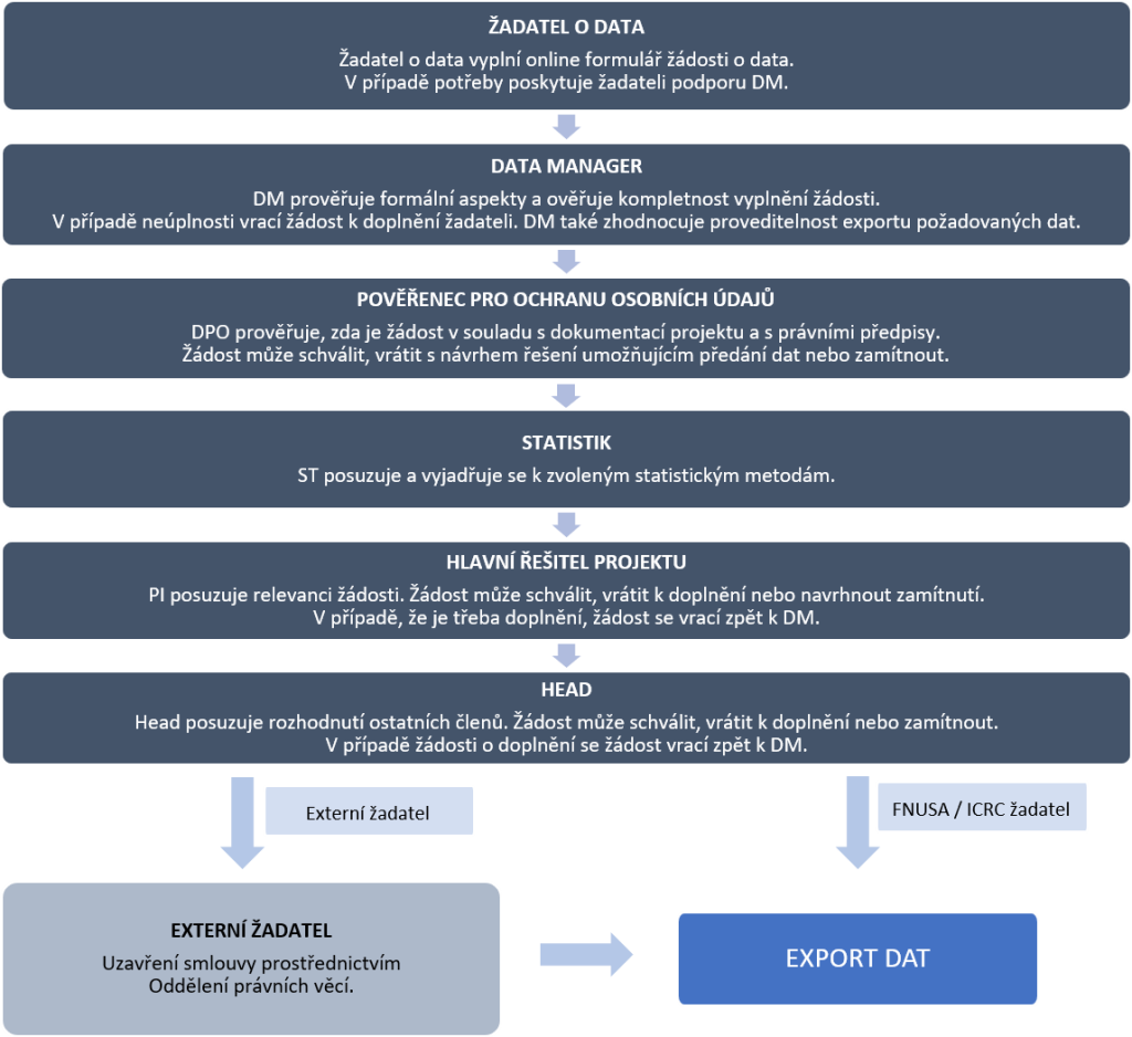 O data se žádá prostřednictvím online formuláře, schvalovací proces běží elektronickou cestou a o výsledku jsou žadatelé vyrozuměni. Požadavek včetně navržených metod posuzuje i naše oddělení Biostatistiky, kdy můžeme navrhnout adekvátnější postup a metodiku nebo lze přímo využít našich služeb. Všechny žádosti o data včetně samotného předání dat jsou evidované. Bezpečnost informací je pro nás vždy na prvním místě.